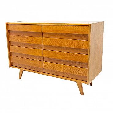 Cassettiera, modello no. U-453, disegnata da Jiří Jiroutek per Interiér Praha. È stata realizzata nell'ex Cecoslovacchia negli anni '60. Questo modello è associato alla famosa EXPO 58 di Bruxelles. È fatto di legno di quercia e compensato e i cassetti hanno parti interne in plastica. La cassapanca è in ottime condizioni, completamente rinnovata.