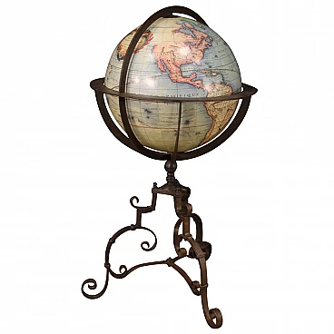 Grande mappamondo italiano del XX secolo. Mobile con struttura in ferro battuto e forgiato con globo terrestre stampato rivestito in carta raffigurato in stile antico. Mappamondo di grande misura e impatto per antiquari e arredatori, ideale da inserire in un salone o studio. Oggetto di favolosa decorazione e difficile reperibilità con struttura che permette la rotazione (a 360 gradi) e l'inclinazione (di 90 gradi) del mappamondo (vedi foto). Struttura in bella patina, globo terrestre con qualche segno di usura (vedi foto). Oggetto nel complesso in buono stato conservativo.
