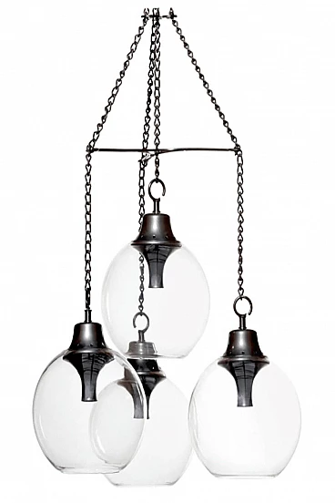 Lampadario Grappolo LS10 a quattro sfere, 1967. Il lampadario è stato realizzato con ottone brunito e distanziatore in alluminio, sfere in vetro soffiato. Esposto alla Biennale di Venezia 2018 per la mostra-installazione Meraviglie Quotidiane a cura di Cino Zucchi. Leggeri graffi dovuti all'età e all'uso.