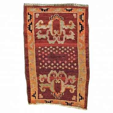 Piccolo tappeto tibetano da meditazione. Il colore rosso/arancione è il più usato nei monasteri. Insolito il decoro che è un misto di elementi floreali e geometrici. Anticamente annodati in Tibet e nelle regioni limitrofe, i tappeti tibetani Khaden erano utilizzati dalle popolazioni indigene per il loro uso interno: come seduta o letto, per la meditazione nelle loro case o nei templi. Ecco perché le dimensioni di questo tappeto sono tradizionalmente piccole.