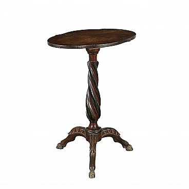 Tavolino a vela inglese, sorretto da un balaustro centrale a vela poggiante su gambe mosse e intagliate con motivi fogliacei e terminanti in piedi caprini; piano sagomato. In legno di quercia.