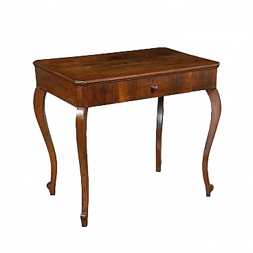 Tavolino Luigi Filippo sorretto da gambe mosse, nella fascia sottopiano presenta un cassetto. In noce, gli interni sono in abete.