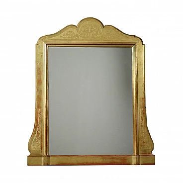 Specchiera da appoggio Umbertina in legno dorato, con decorazioni fitomorfe realizzate a bulino nelle alette laterali e nella cimasa.