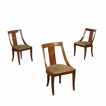 Gruppo di tre sedie a gondola impero di produzione lombarda, sorrette da gambe a sciabola, la seduta è imbottita, mentre lo schienale a giorno presenta nella fascia verticale intarsio floreale in ottone dorato. In noce.