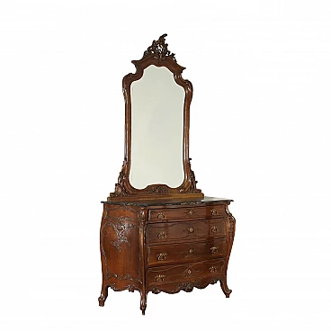 Comò con specchiera in stile barocchetto, mosso in tutte le sue parti e intagliato a motivi fitomorfi. Specchiera con vetro bisellato, piano in marmo Portoro, 4 cassetti di cui 1 di minori dimensioni nella fascia sottopiano e bocchette e maniglie in bronzo dorato. Realizzato in noce, interni in castagno. Rotture come da foto sul fronte di uno dei cassetti.