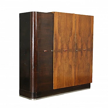 Mobile armadio ad ante battenti, legno impiallacciato radica e Pioppo tinto, profilo in metallo alla base.