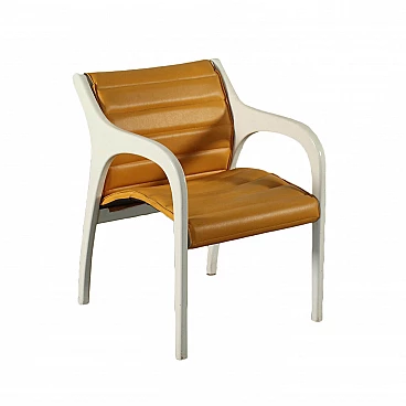 Sedia con braccioli, legno laccato, imbottitura in espanso, rivestimento in similpelle.