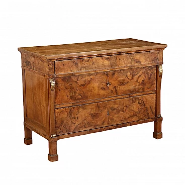 Comò in stile Restaurazione con ottone e impiallacciatura di radica di noce, '800