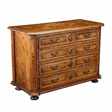 Comò Barocco piemontese, sorretto da piedini torniti, sul fronte presenta quattro cassetti ornati con formelle, montanti a 45°. In noce, ornato sui fianchi e sul fronte con caratteristici intarsi a volute, gli interni sono in pioppo.