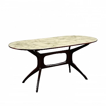 Tavolo ovale anni '50 con struttura in legno tinto e piano in vetro retro trattato effetto marmo.