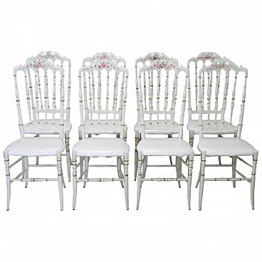 Bellissima intorvabile serie di otto chiavarine modello parigina databili verso la fine del secolo XIX. Laccate con decorazioni floreali dipinte a mano e parti dorate in foglia oro. Ottime condizioni strutturali le sedute sono state rifatte completamente e lasciate in bianco per dare libera scelta al cliente secondo i suoi gusti. Presenti alcuni segni di usura nella laccatura che donano comunque quel particolare sapore antico. Prezzo trattabile inviate pure le vostre proposte di acquisto. MISURE IN CM H 108 cm x L 43 cm x P 45 cm H SEDUTA 49 cm