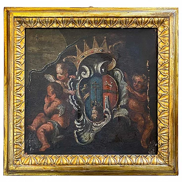 Dipinto olio su tela di angeli con uno stemma nobiliare, '600