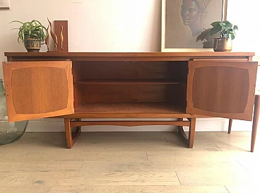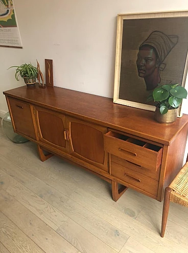 Splendida credenza in teak massello, di design originale danese, a tre cassetti laterali, due ante centrali e una ribalta, su gambe in legno curvato che sono la sua particolarità. Anni '50. #designscandinavo