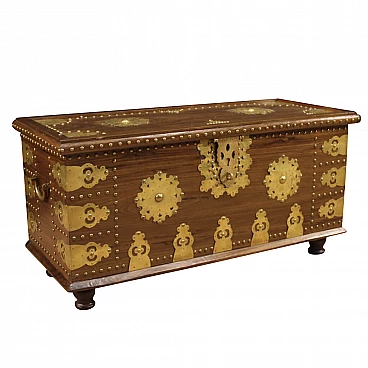 Cassapanca indiana del XX secolo. Mobile scolpito in legno esotico riccamente adornato da decori in metallo cesellato e dorato. Baule munito di maniglie laterali e chiusura frontale, mancante di lucchetto. Interno di ottima capacità completo di piccolo cassetto laterale con vano segreto. Cassapanca di ottima proporzione facilmente inseribile in diversi punti della casa, per antiquari e arredatori. Strutturalmente sana, presenta qualche piccolo segno del tempo (vedi foto), nel complesso in buono stato conservativo.