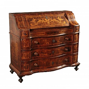 Mobile veronese a ribalta, risalente alla metà del XVIII secolo. In abete lastronato in radica di noce con filettature in acero e cipresso. Sul fronte sono presenti tre cassetti mossi a balestra, sormontati da un'anta a ribalta che nasconde uno scarabattolo composto da sei cassetti, dei quali quelli laterali danno accesso a segreti nascosti dai montanti mossi. Nel piano della ribalta è presente un'antina scorrevole che nasconde un altro segreto sottostante. Due ulteriori cassettini si trovano nei montanti laterali. Sulla ribalta, entro una riserva, è presente un intarsio in acero a volute vegetali con due pappagalli. Le serrature in ferro battuto sono incise sul retro con un motivo a losanga; quella dell'anta è stata sostituita.