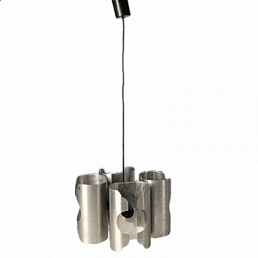 Lampadario in acciaio satinato con 4 punti luce, prodotto negli anni '80 in Italia. L'oggetto si presenta in buone condizioni ed utilizzabile, leggera usura dovuta all'età e all'utilizzo.