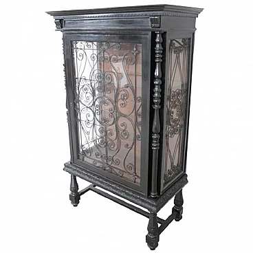 Impressionante vetrinetta antica in perfetto stile rinascimeno fiorentino italiano. Realizzata in legno di noce ebanizzato e finemente intagliato. Sul davanti, importanti colonne decorative tornite. Anche i piedi sono realizzati con tornitura su legno massello. Vetri presenti su ciascun lato per una visione completa degli oggetti interni. Di grande valore è la grata decorativa in ferro battuto sul fronte dei vetri con raffinate decorazioni a riccioli e fiori. Internamente le mensole sono in vetro. Perfetta per l'esposizione in maniera elegante dei vostri piccoli oggetti da collezione. Articolo usato presenta segi a livello di finitura alcuni piccoli fori da tarlo nella parte bassa manca serratura e chiave. Si consiglia di guardare bene nel dettaglio tutte le immagini.