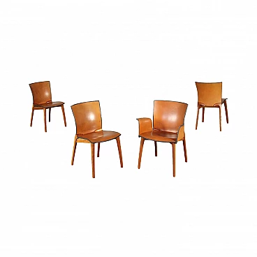 Set di quattro sedie in legno di faggio e pelle anni 90 di cui una con braccioli, modello Cos di Cassina.