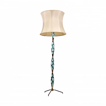 Lampada da terra anni '50 in ottone e ceramica con paralume in tessuto.
