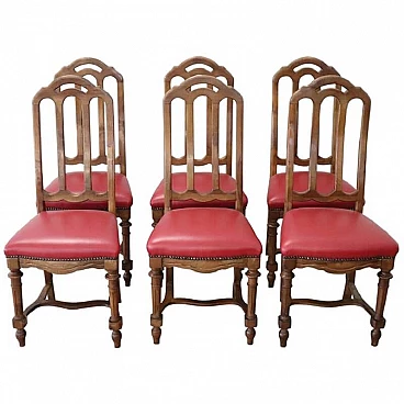 Bellissima intorvabile serie di sei sedie antiche epoca umbertina fine Ottocento realizzate in legno di noce massello schienale alto e slanciato seduta ampia e comoda rivestita in similpelle rossa in ottime condizioni. L'imbottitura è in ottime condizioni. Dal punto di vista ligneo non necessitano incollaggio buona stabilità da segnalare solo piccoli segni di usura a livello di finitura e qualche foro da tarlo presente in alcune sedie. Tutti dettagli visibili in foto si prega di guardare bene le immagini.