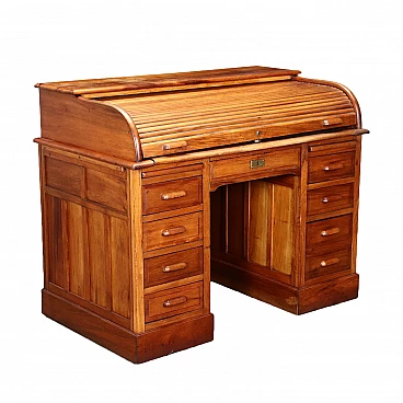 Scrivania Liberty, presenta due file di cassetti ai lati del vano per le gambe e un cassetto posto nella fascia sottopiano. Anta a coulisse cela piano scrittoio estraibile e scarabattolo con vani porta documenti e cassetti. In ciliegio.