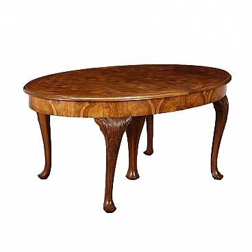 Tavolo allungabile in stile Chippendale, sorretto da gambe mosse e intagliate a volute; impiallacciato in noce. Le prolunghe sono mancanti.