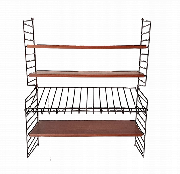 Libreria a muro design modernariato in metallo e legno con mensola in metallo inclinata porta giornali da esposizione anni 60/70. Buono stato di conservazione, pronta da essere montata. Profondità mensole cm 25 e 19 cm