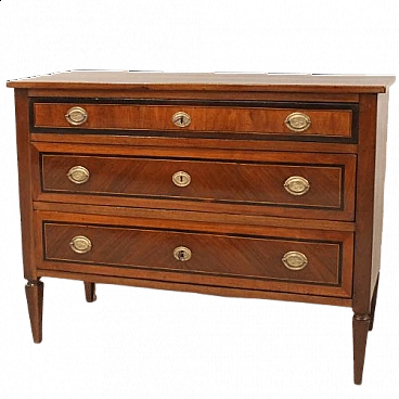 Cassettone Luigi XVI a 3 cassetti. In noce massello e lastronato in noce, intarsiato e filettato in vari legni pregiati - completo di serrature originali funzionanti Epoca seconda metà 700 - Luigi XVI. Provenienza Italia - Emilia Romagna , Bologna. Restaurato (vedere foto). Sulle reali condizioni dell'oggetto valutare le fotografie in quanto hanno valore prioritario e non discutibile. Rilasciamo certificato di autenticità.