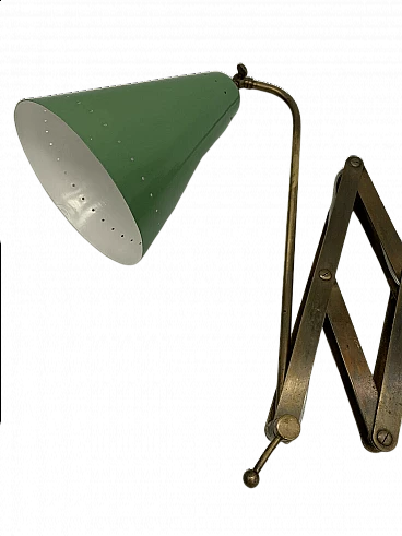 Eccellenti condizioni generali, parte portante in ottone appositamente poco pulito. Impianto elettrico rifatto e funzionante. Lampada da parete estensibile. Parte finale, campana, in lamiera. La parte colorata ha qualche segno del tempo, ma ancora molto bella. Pronta all'uso. Lunghezza massima 120cm.