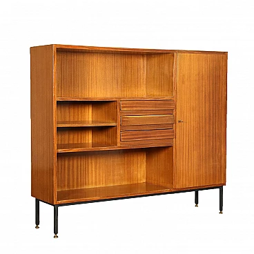 Mobile anni '60 in legno impiallacciato mogano con anta battente, cassetti e vani a giorno. Base in metallo e piedi in ottone.