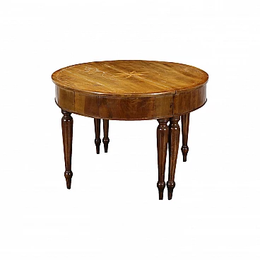 Tavolo rotondo allungabile intarsiato, con piano recante rosa dei venti centrale, greca a volute e filettature in acero; gambe troncoconiche terminanti con piedi a pera. Realizzato in noce. Intarsi in legni vari.
