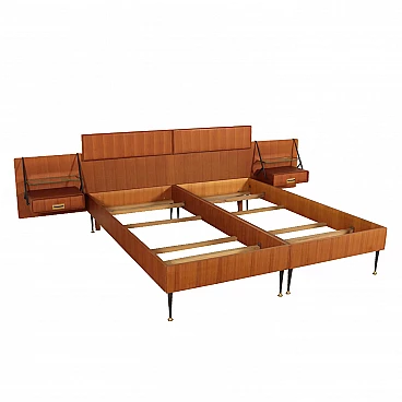 Letto matrimoniale disegnato da Silvio Cavatorta, con comodini pensili appesi; legno impiallacciato teak, metallo, ottone, vetro. Misure interne: 193x84