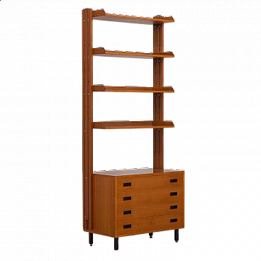 Libreria italiana indipendente disegnata nello stile di Gianfranco Frattini, degli anni '70. I ripiani e un armadietto sono impiallacciati in teak e montati su ampi supporti in legno con due viti per lato, che danno al mobile molta stabilità. Anche la parte posteriore è impiallacciata, il che lo rende un perfetto divisorio. I piedini regolabili di 13 cm di altezza aiutano a livellare l'unità su terreni irregolari come piastrelle, vecchio pavimento di legno, ecc. Questo elemento è composto da un cassettone con quattro cassetti con supporti scultorei in legno nero (H 49 cm - L 76 cm - P 43 cm - altezza cassetti 10 cm); quattro ripiani flangiati (profondità 30 cm, altezza flange 5 cm); 2 supporti in legno (H 181cm - L 12cm - P 2cm). Il pezzo è in ottime condizioni originali con piccoli segni d'uso.