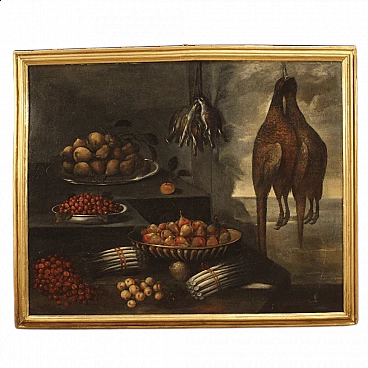Dipinto a olio su tela raffigurante una natura morta con frutta, verdura e cacciagione, '600. Ha subito un intenso intervento di restauro conservativo, rintelo, sostituzione del telaio e ripresa del colore in diversi punti. Cornice antica non coeva in legno e gesso, scolpita e dorata; è stata ridorata nel corso del '900. Senza la cornice il dipinto misura 106 x 132 cm.