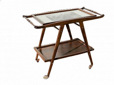 Bel carrello vintage portavivande in legno. Questo carrello risale agli anni '50 del XX secolo, è stato prodotto in Italia nel classico design dell' epoca. In legno laccato, ha il vassoio superiore asportabile per un comodo utilizzo, con stampa in bianco e nero protetta da vetro. E' munito di ruote girevoli con copertura in ottone. Oggetto restaurato, si presenta in ottime condizioni con alcune tracce del tempo.