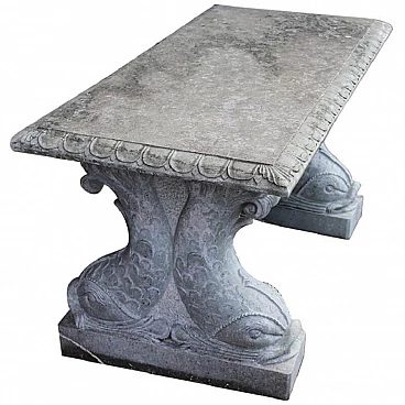Bellissimo grande tavolo da giardino in marmo scolpito tonalità tendente grigio / verde. Decorazioni di gusto classico con particolari gambe a forma di tritone. Databile intorno agli anni 1920 circa. Perfetto come arredo da giardino. Usato presenta segni di usura e di trascorrere del tempo. Prezzo trattabile inviate pure la vostra proposta di acquisto.