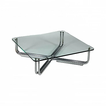 Tavolino da centro, base in metallo cromato, piano in vetro.