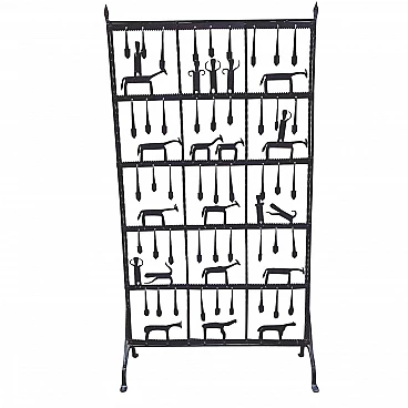 Paravento decorativo artigianale in ferro battuto, rustico e unico. Il suo design minimale ricorda l'arte medievale, con figure umane e animali decorate a bulino.