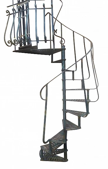 Scala a chiocciola Liberty in ferro, usurata del tempo e con il sesto gradino rotto, come da foto. Altre parti usurate dal tempo in quanto originale. La scala necessita di restauro in tutte le parti. Proveniente da una casa Liberty. Larghezza del gradino 59 cm.