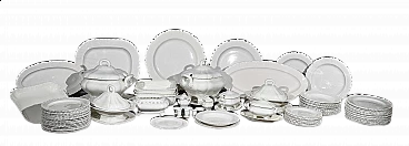 Il servizio è stato trovato ancora imballato nella cassa di legno dove era stato riposto e mai utilizzato. Si tratta di un servizio nuovo mai utilizzato praticamente giunto ai nostri giorni nuovo, intonso, perfetto. Il servizio si compone di: 35 piatti piani di diametro 25cm; 12 piatti fondi di diametro 25cm; 12 piatti da dolce di diamtro 21cm; 2 zuppiere grandi con coperchio più 2 piatti grandi rettangolari; 2 zuppiere alzatine da 36 x 24 x h 28cm più 2 piatti rettangolari; 3 piatti da portata a forma di ciotola quadrata di 26 x 26 x h 8,5cm; 1 piatto rettangolare dal bordo alto; 2 piatti ovali grandi di 58 x 29cm più 2 piatti ovali piccoli; 1 piatto rotondo grande di diametro 42.5cm; 1 piatto rettangolare grande di 44 x 35cm; 1 piatto rotondo. Ci sono anche 2 piccole zuppiere con 2 piatti ovali piccoli, 2 formaggere, 3 portauova, 3 portastecchini, 1 ciotola traforata, 4 cucchiaini di ceramica. Per un totale di 93 pezzi.