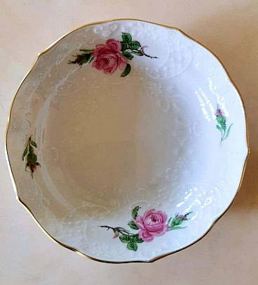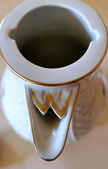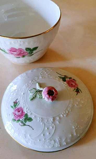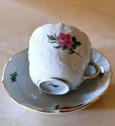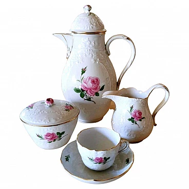 Raro servizio da caffè in porcellana di Meissen in stile Biedermeier. Il set è composto da una teiera, una zuccheriera, una lattiera e 11 tazze con piatto. I vari pezzi sono realizzati in fine porcellana bianca dura dipinta a mano con la decorazione a rose rosa arricchita su tutti i pezzi da sontuose decorazioni in rilievo non dipinte. L'esecuzione di questo motivo ornamentale con fiori delicati e aggraziati era affidata solo ai pittori più esperti e capaci, quelli in possesso del prestigioso diploma conseguito presso la Scuola di Disegno di Meissen istituita dal 1764. I pomelli della teiera e della zuccheriera rappresentano due armoniosi e graziosi boccioli di rosa, anch'essi realizzati a mano. I bordi delle tazze e dei piattini sono smerlati e rifiniti in oro zecchino così come le altre decorazioni della teiera e della zuccheriera. Tutti i pezzi portano il marchio originale di Meissen (due spade incrociate) e dalla lista allegata si può affermare con certezza che questo servizio è stato prodotto tra il 1934 e il 1944, inoltre sugli oggetti il modello è scritto a mano (61/106), questa dicitura rende i manufatti ancora più preziosi e apprezzati in quanto conservano tutte le caratteristiche della calligrafia dell'autore. Misure teiera: larghezza cm.18, diametro cm.13, altezza cm.25. Misure zuccheriera: diametro cm.10, altezza cm.10. Misure lattiera: larghezza cm.14, diametro cm.7, altezza cm.11. Misure tazza singola: diametro cm.7 altezza cm.5. Misure piattino per tazza: diametro cm.11, altezza cm.7.