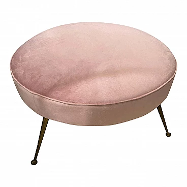 Pouf rotondo in velluto rosa e ottone, anni '50