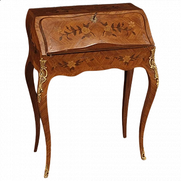 Ribaltina francese a gamba alta del XX secolo. Mobile intarsiato in legni di bois de rose, acero, mogano, ciliegio e legni da frutto con decori floreali di grande piacevolezza. Ribalta munita internamente di due cassettini, un vano a scomparsa e piano scrittoio di misura contenuta. Mobile completo di una chiave funzionante piacevolmente adornato da bronzo dorato e cesellato (vedi foto). Ribaltina di misura contenuta, facilmente inseribile in diversi punti della casa, di ottima proporzione. Presenta qualche piccolo segno di intervento di restauro conservativo e alcuni graffi (vedi foto). Strutturalmente sana, nel complesso in discreto stato conservativo.