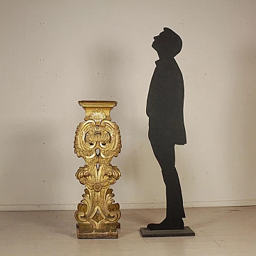 Elegante colonna portavaso composto da coppia di gambe raccordate da traversa tornita e ripiano. Riccamente intagliato con volute ed elementi fogliacei.