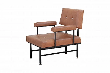 Poltrona scandinava degli anni 60 con tappezzeria in skai, struttura in ferro e piedini in ottone. In ottime condizioni. Effettuati lievi interventi di restauro su tappezzeria ed imbottitura (comunque ancora l'originale).