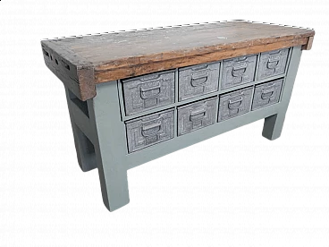 Bancone da falegname in abete laccato con cassetti in metallo anni '50, restaurato.