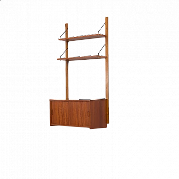 Questo pensile danese in teak è stato realizzato negli anni '60. È largo 75 cm e si adatta bene a un piccolo spazio abitativo o a un ingresso. Questo set è composto da: uno scaffale (profondo 20 cm), uno scaffale (profondo 24 cm), un armadio con ante scorrevoli (H 41 cm - L 75 cm - P 42 cm), due binari di legno (lunghi 150 cm), ferramenta in metallo nero. Questo sistema di scaffalatura modulare permette di adattare la disposizione alle proprie esigenze. Le fessure nei binari sono posizionate ogni 5 cm. Il set è in una condizione fantastica con minimi segni di usura, rinfrescato con gli strati aggiuntivi di olio danese.