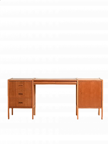 Scrivania scandinava in teak composta da tre parti. Il piano centrale poggia a incastro sulle due basi laterali, di cui una presenta tre cassetti e l’altra un vano dotato di serratura. Sotto l’asse centrale si trovano altri due comodi cassetti, utili per riporre penne, libri e pc. Il colore caldo del teak e le linee moderne sapranno donare carattere alla stanza. Buone condizioni. È stato ripulito, trattato con gommalacca cerata e con pura cera d’api di carnauba. Per piacere presta attenzione alle fotografie.