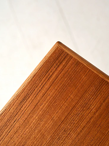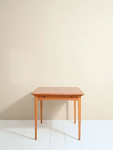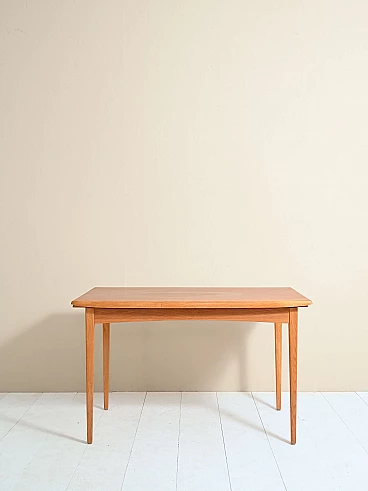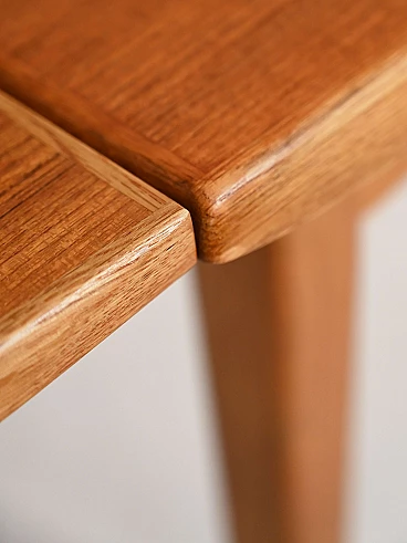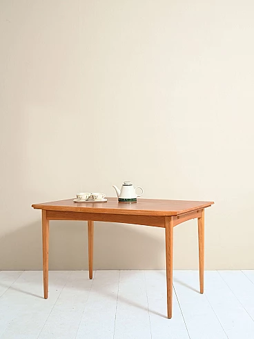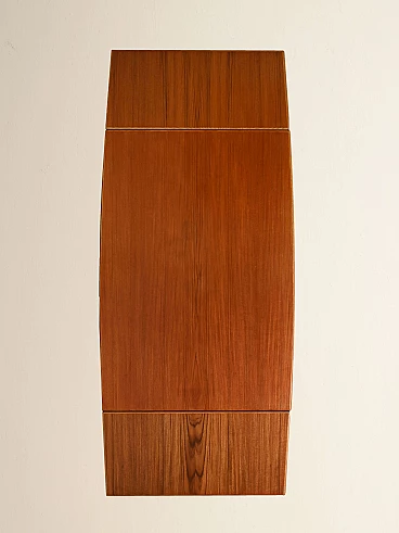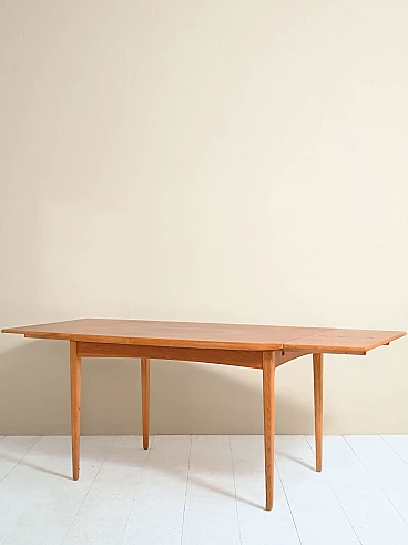 Tavolo anni ’60 dalla manifattura danese. Le lunghe gambe e il piano dai bordi curvati sono le caratteristiche di questo pezzo di provenienza scandinava. Il tavolo può essere allungato all’occorrenza semplicemente estraendo i due lati che si trovano sotto il piano centrale. Un metodo efficace per salvare spazio in soggiorno o in cucina. Il design sobrio ed elegante e le sfumature dorate del legno lo rendono un tavolo perfetto per essere inserito in diversi tipi di ambienti.