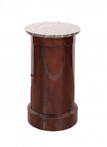 Comodino Impero francese in piuma di mogano con piano in marmo grigio belga. L'anta centrale si apre con un pomello in legno mentre all'interno ci sono due ripiani in legno. La particolare forma gli permette di avere una doppia funzione di comodino e di colonna. Condizioni generali: Restaurato dai nostri maestri artigiani con metodo tradizionale a gommalacca e alcool artigianale. Provenienza: XIX secolo Francia. Documento: Certificato di autenticità. Siamo a vostra disposizione per ulteriori chiarimenti o dettagli fotografici